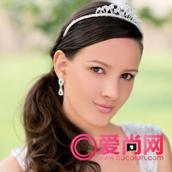 活泼清爽的马尾辫,凸显出新娘纯然清雅的质地,不仅简单而且漂亮。卷卷的头发让活泼的马尾显得不那么单调,在可爱之中增加不少女人魅力。如果你还是觉得略显清谈,配上一顶精巧雅致的头冠,就会让整个发型设计变得生动起来。让你做最迷人的公主新娘。