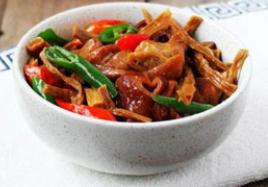 熟肥肠400克、干笋尖100克、小青椒3个、小红椒3个。