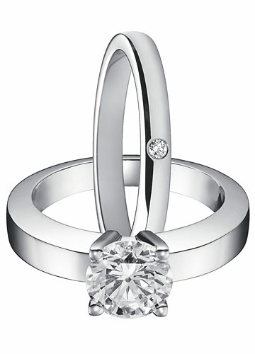 设计灵感:Solitaire 1895 系列铂金订婚钻戒,铺镶圆形明亮式切割钻石,一颗圆形明亮式切割中央钻石;可与之搭配的Ballerine系列铂金结婚对戒,镶嵌圆形明亮式切割钻石。