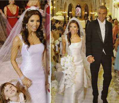 Eva 和Tony的结婚戒指,是属于Piaget的Possession钻戒,并用法文刻上了彼此刻骨铭心的爱语。新娘子镶有80颗钻石,18K白金的钻戒价值25000美元。除了结婚戒指,Tony 还收到了Eva 赠送价值45000 美元的Piaget腕表,腕表上镶有9 颗钻石(代表Tony 在马刺队的球衣号)。Viktor & Rolf为H&M设计的婚纱,售价为349美元-比起动辄几千美金的名师婚纱设计,Viktor&Rolf设计的婚纱引来抢购风潮,原因很简单,一是因为这对双子设计师实在太有名,另外因为它的价格——售价仅349美元。在国外,很多设计师在婚纱上做文章,将新娘婚纱玩出了花样。今年三月,在伦敦举行的《新娘靠边闪》名人服装拍卖展上,前英国小姐达尼丽。