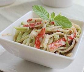 4、把切好的黄瓜和蟹肉放到碗里倒入盐、香油、芥末油。