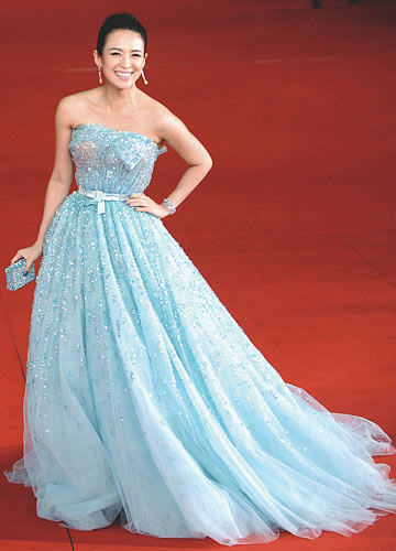 淡蓝层叠轻纱制造云雾般的梦幻裙摆,点缀星星点点的亮片,闪烁星辰般的光泽。丝缎腰带,勾勒纤细腰身。这样的她少了锐气,多了柔美淡泊的气场,却比以往任何时候都美,定能重返巅峰。