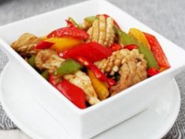鲜鱿鱼600克、青椒30克、红椒30克、黄椒30克、小米椒1个、姜、蒜头、葱、蚝油3克、沙茶酱3克、盐、米酒。