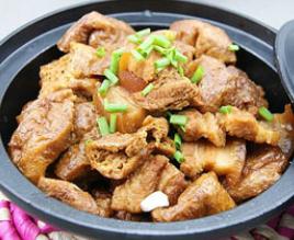 五花肉300克、豆腐炸50克、李锦记秘制红烧汁50毫升、清水300毫升、姜几片