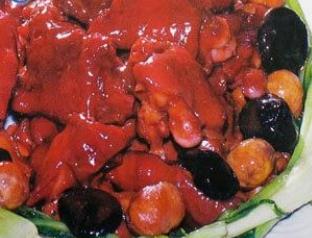 ②烧热锅,下油,至七成熟时,将猪蹄放入,炸15分钟后倒进漏勺滤去油。栗子煮熟,去壳、膜,下热油锅炸5分钟捞出。