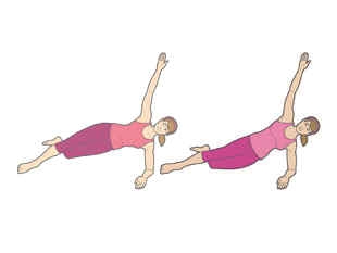 六、侧卧提臀。1.身体压左肘(肘部位于肩部正下方)侧卧,右臂举起。身体向上抬高,同时伸展右腿,左腿弯曲至身后,落于地面。2.将臀部降低几英寸,然后重新抬高。慢慢重复小幅度升降动作,然后换右侧,重复全套动作。