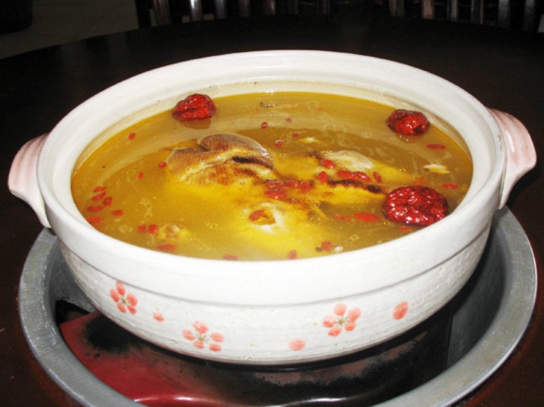 金银花25克,水鸭1只,无花果2粒,陈皮1/4片,鲜姜2片,清水1000毫升,盐少许。做法:金银花洗净,水鸭洗干净后放入滚水内煮5分钟,取出;陈皮洗干净、泡软刮去囊;清水1000毫升煮沸,将金银花、水鸭、无花果、陈皮、姜加入煲滚,改用文火煲两个小时,加盐调味。此汤具有清热解毒之功效。