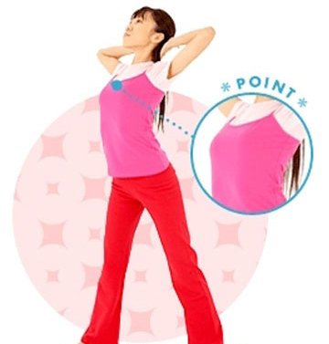 2、右脚往右大大地跨出一步,步幅是肩宽的两倍,双臂向左右屈肘,双手扶着后脑勺,向后打开胸廓,腰以上的部位向上仰起,吸气3秒。