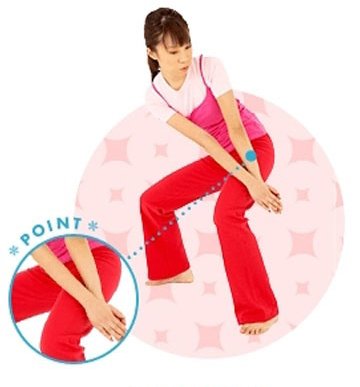 3、双膝往前弯曲,臀部下沉,上身微微前倾,令上身、大腿、小腿两两成90度,双臂伸直下摆,边呼气边摆向左侧击掌,定住保持3秒后,恢复仰身的姿势,再在右侧击掌。