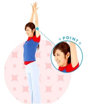 2、保持站直的姿势,双臂往上举高,在头顶上方击掌,同时上身肌肉往上拉伸,但注意上臂不要贴在耳朵上,与头部离开一定的距离。