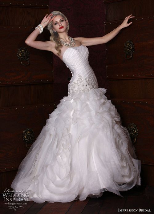 薄纱层叠裙摆,鱼尾婚纱也可以很可爱。