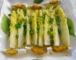 1、娃娃菜切成八块,咸蛋去皮也切成8片。