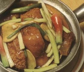 辅料:姜数片、蒜茸一汤匙、南乳半汤匙、磨鼓一汤匙葱三条切段、酒2汤匙、香菜2棵、豆腐、盐、糖、生抽、老抽、果皮八角、生粉各适量。