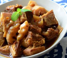 牛腩一斤、莲藕一节、洋葱一个、沙茶酱2汤匙、豆瓣酱1汤匙、料酒少许、老抽少许。