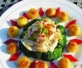1、西兰花切成重约30克的块,锅中加入二汤烧开,入2克盐、2克味精,放入西兰花大火汆约1分钟捞出沥水,锅中加入10克色拉油烧制六成热,放入蒜米爆香,入西兰花翻炒,加入2克盐、2克味精调味,用3克水淀粉勾芡,淋入3克明油出锅摆在盘子的周围。