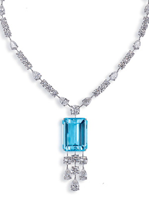 蓝色的四方形宝石在这款项链里显的很耀眼,将整款项链的奢华感显现出来,白金镶钻石的链条呈双排状的设计也为这款项链增加了奢华的味道。这款千里共婵娟系列的项链寓意着新人们之间永恒的爱恋。