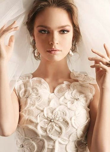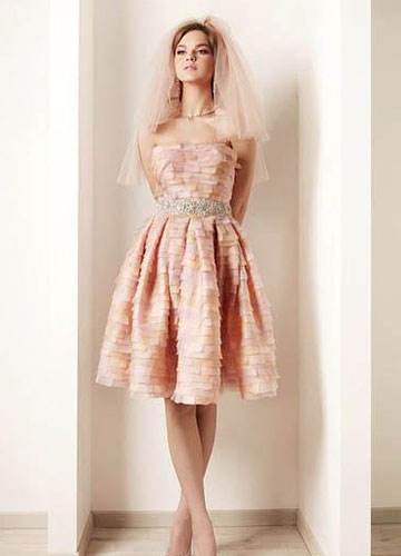 Rami Kadi2012婚纱大量运用好造型的欧根纱,塑造出华美的大裙摆。并且裙摆十足的分量感与紧裹的上半身形成强烈的对比,凸显新娘完美曲线。褶皱的运用炉火纯青,在塑造出丰满的胸部曲线同时在腰部收紧,玲珑有致,令人羡慕。虽然极其重视装饰细节,但却简洁大方,并没有小而密的繁复之感。另外,唯美粉彩色的运用则增加新娘的可爱度,华美是必要的,但绝不要老气哦。