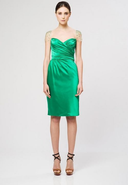 靓丽的翡翠绿色礼服,华丽的缎面,轻盈如蚕丝的袖子设计别具一格。