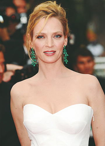 荷叶边裹胸礼服,配绿宝石及祖母绿大项链及耳环、戒指,饱满罕见的色泽尽显奢华。