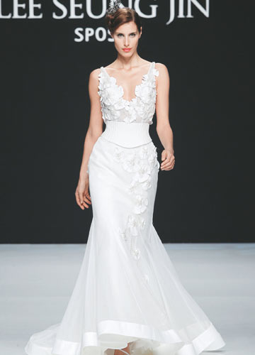 深V设计与鱼尾裙摆勾勒性感身形,立体花朵点缀增加精致细节看点,收紧的宽版腰带勾勒出身材的黄金比例。朦胧而高贵的新娘形象立显。