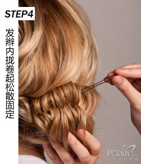 轻轻将发辫抓松散让其更丰满,发辫两侧用U型发夹插进发髻里,分别固定。