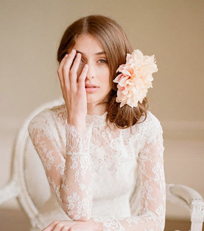 新娘的秀发全部扎在左下,蓬松感十足的发髻上扎了一朵盛开的淡粉大花,和蕾丝的婚纱十分相配。