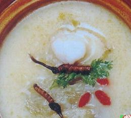 先将九孔鲍清洗干净,焯水,加入高汤用小火炖2小时。取沙锅放入高汤,加入发好的鱼翅、鲍鱼、虫草、绍洒上火烧沸。放精盐、味精调好味,放在加人酒精的炉上,即可上桌。