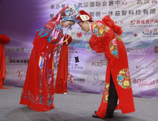 凤冠霞帔是钟情于古装婚纱的新娘不可错过的,华丽的装饰,喜庆的色彩,是典型的中国传统新娘风格。当新郎身穿长衫马褂,簪花挂红,手扶花轿而行。而新娘身穿绣花裙褂,头顶凤冠霞帔,上面盖着一块红方巾。坐在缓缓前行的八抬大轿中,听着鼓乐喧天的乐曲,看着外面驻足观望的人群,让新娘感觉到像置身于梦境一般,顿时感到脸上一圈红晕泛起,心里甜丝丝的,好像自己就是那月亮中古典而美丽的嫦娥,享受着甜蜜的幸福。就让我们来晒一下,看过或是亲身经历过的中国传统式婚礼吧!
