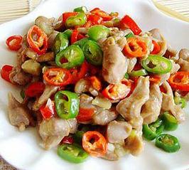 鸡胗500g、榨菜1包、青尖椒2个、红尖椒2个、泡椒50g