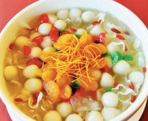 ③在锅内煮滚热水放下汤圆用小火煮至浮起(约6分钟),加入白糖及橘子瓣再煮片刻,即可装入大汤碗内,加入桂花酱调合即可。
