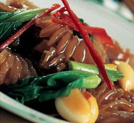 2、往锅里倒油,烧热,放葱、辣椒、大蒜爆香,再放入牛筋、味精、糖、酒、番茄酱、盐、水,用3、小火焖煮40 分钟,然后夹出葱、辣椒、蒜,用水淀粉勾芡,淋上香油炒匀即可