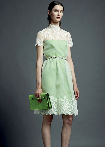 薄荷绿色蕾丝小礼服,蕾丝高领设计复古风十足。