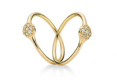 具有浓厚经典复古味道的一款新娘婚戒,戒环用小颗粒的钻石密集镶嵌而成,戒托用钻石所组成的花朵状组成,中间圆形的钻石令新娘的指间具有一种独特的优雅感。