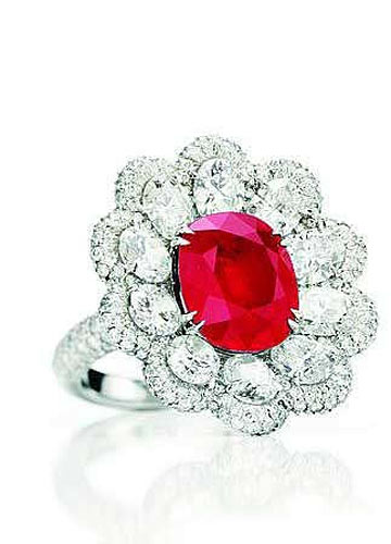 晶莹的钻石衬托艳丽红色宝石,像一朵热烈的太阳花盛开在新娘的指尖。