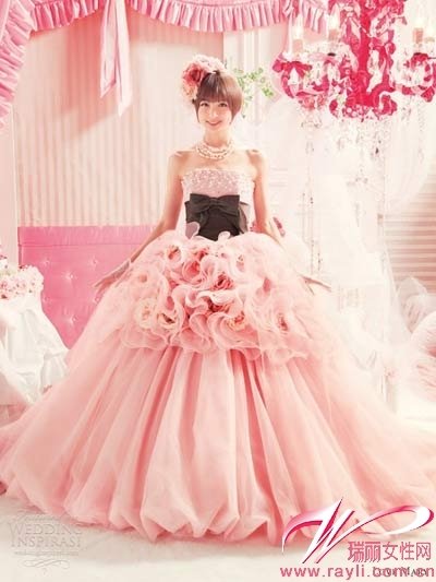Love Mary的婚纱均采用大公主裙造型,特别符合女孩们梦中的新娘形象。而且日系的甜美感也从来不怕夸张表现,于是各种色彩都应用到婚纱上,白色、粉色自然少不了,还有豆绿色、耦合色以及海军蓝,像春天的花园一样给人繁花似锦的感觉。蝴蝶结与花朵造型成为最佳配饰,搭配在头上和腰间。总之,整个人的造型像卡通画里的人物一样可爱,卡哇咿的甜美婚纱你爱不爱?