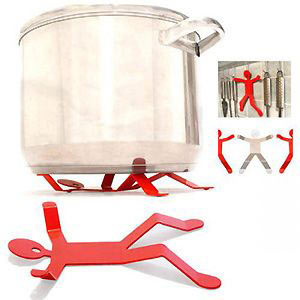 这是一个人形的不锈钢用具,看他神情夸张,双手力顶千钧。那么,这样一个四肢张开的不锈钢小人,它的真实用途究竟是什么呢?这其实是一款用来防止热锅烫坏桌面的支撑架。让这个充满活力的小人躺在下面为你撑起热锅吧。