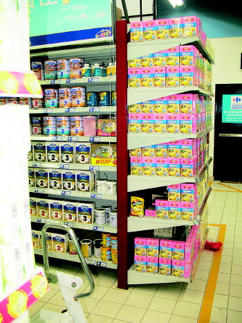 ▲某品牌牛初乳配方产品备受冷落,打起了促销牌。(见习记者 赵冉 摄)