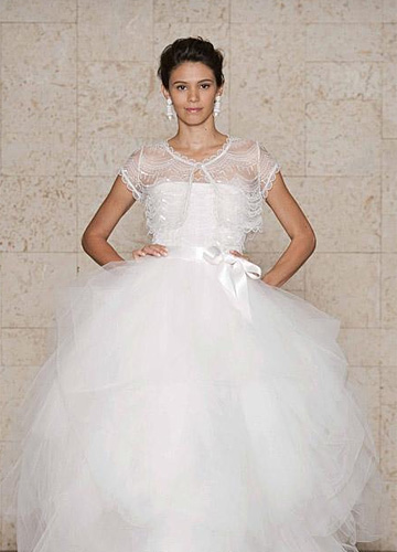 正如每到初秋都要为自己的衣柜添置几款针织衫、小西装一样,小外套同样可以在秋季的婚纱礼服造型中发挥自己的作用,当然材质会换成轻薄的纱与蕾丝,款式上也要注意与婚纱的呼应,例如用高腰剪裁的蕾丝长袖小外套搭配较为修身、材质较挺括的缎面婚纱礼服,塑造修长挺拔的身体线条,或是用轻盈的纱质褶皱外套搭配束腰蓬裙,突出纤细的腰线。