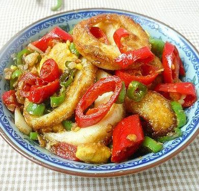7)锅内留底油,将青红椒大火翻炒半分钟;