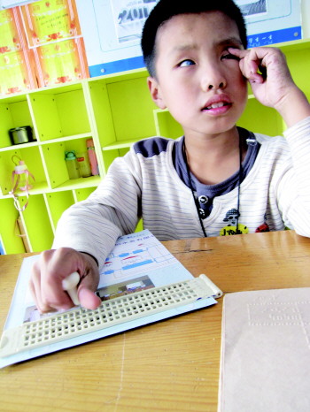 临沂特殊教育中心的盲童在捐助的挂历上练习。