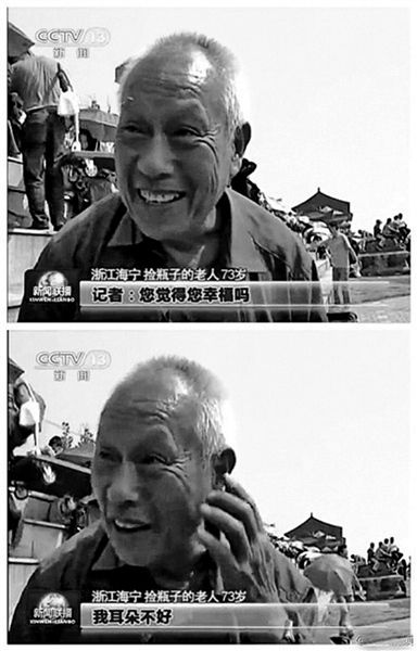 一名73岁的拾荒老人面对“您幸福吗”的问题。