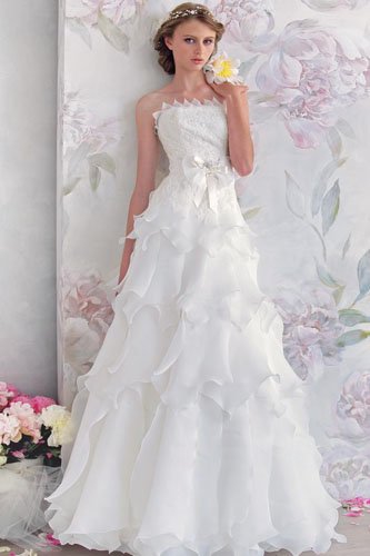 简约的A型婚纱适合身材丰满的新娘,可以减少拖沓沉重的感觉。腰部的蝴蝶结缎带轻垂落下增添了礼服的隆重感觉。