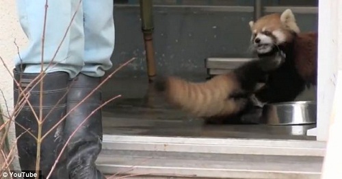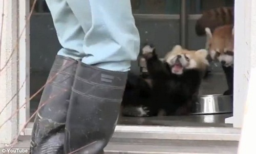 小浣熊宝宝被突然出现的动物园饲养员吓坏,表情夸张的四脚朝天倒在地上