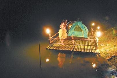 尽管梁小姐已经在几天前就回到了广东,但她的“末日日记”依旧火爆,尤其是她上传的与“诺亚方舟”有关的照片。有一张照片,一个竹排漂浮在水上,上面搭了一个帐篷,竹排上还闪烁着灯光。上传的照片上,还有很多梁小姐穿着用树叶、羽毛做成的衣服,暴露“尺度”很大。
