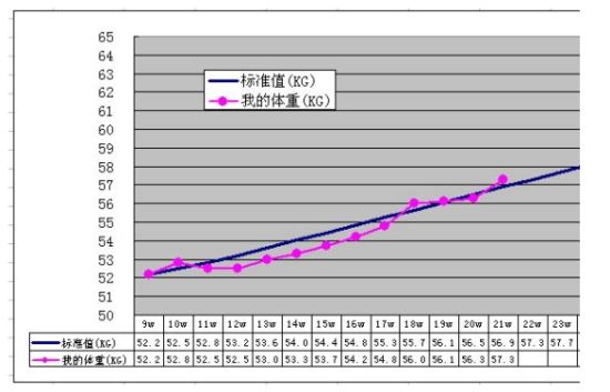 我把增长值平均分配到每一周,得出的结论是孕中期及后期每周增长0.4公斤左右,最后一个月每周增长0.25公斤左右(网上看到的说最后一个月增长会放缓)。于是根据这一数值列了一个孕期体重参考表: