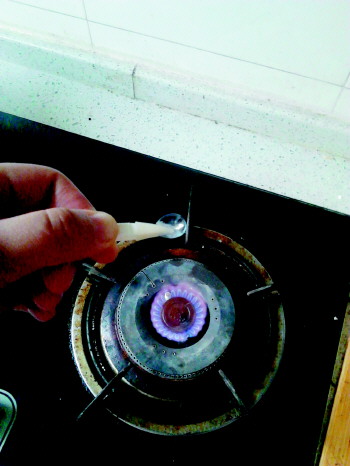 记者移开汤锅,用眼镜夹夹住一只镜片,慢慢接近火源,在火焰上方大约10厘米处静置。烤了3秒钟,发现原本透明的镜片慢慢变白。记者的手有灼热的感觉,坚持到10秒钟后关火。此时,镜片已经变得非常硬,但是并没有熔化的迹象。