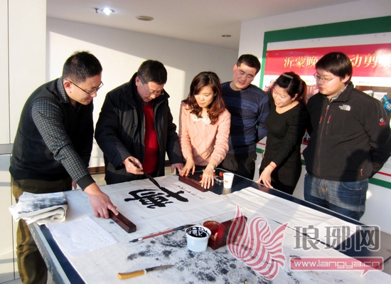 30日下午,临沂市著名书法家陈元方(左二)专程赶到晚报,挥毫逐字将入选汉字写出。