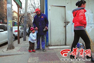 “我早上4点就出来了,媳妇一直到早上8点才带着她出来,要不早上太冷了,娃受不了。”韩师傅说,他和妻子分别清扫卫华巷和骡马市附近的两条马路,从他们当清洁工的第一天起,妻子便把小韩灵带在身边。“为了生活,没有办法。那时她刚会走路,我们一边干活一边得时刻看着她,这路上车多,就怕万一出个啥事。”韩师傅的妻子柳玉翠说,这一带就是一年多。虽然她和丈夫两个人工作很辛苦,但一家人能团聚在一起,再苦也感到很幸福。