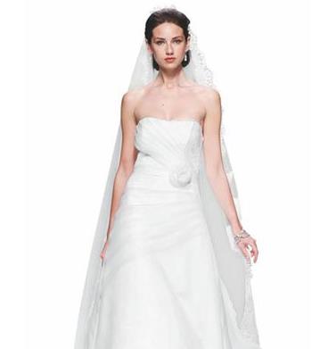 在选择头纱的时候,要注意和婚纱的款式风格相融合。如果是唯美简洁的婚纱,最好也搭配同样简洁的头纱。一般来说,抹胸轻纱款式的婚纱是比较简洁而唯美的,这个时候可以搭配同样简洁而浪漫的及地蕾丝头纱。这样的头纱虽然简洁,但是却是相当的唯美大方,能够与简洁的婚纱相搭配,衬托出新娘的端庄唯美。
