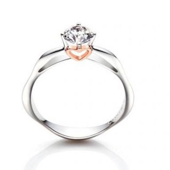 这款结婚戒指设计师以花瓣的造型来表现公主优雅的立领,利用侧面弧度的空间,以优雅的流转线条精细地镶嵌一颗颗小钻,在中间镶以简洁的六爪钻石,将公主般的典雅高贵展现地淋漓尽致。整个界面看起来像是一颗蟠桃,释放出令人倾慕的甜蜜,诠释着美好爱情的真谛。